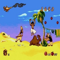 This game is made by Sega/Virgin/Disney in the year 1993. This is a jump'n'run-game. With the stick you move, with A you throw an apple, with B you hit with the sword, with C you jump. It is after the cartoon-movie by Disney. It goes horizontal, but you can climb up sometimes. Apples you haven't unlimited, you must collect them. When you collect a gem, you get an extra-life. The blue lamp is a checkpoint. There are ten levels.