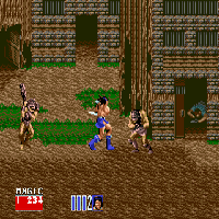 This game is made by Sega in the year 1989. Here you are in a fantasy-world and must fight with a sword. With the stick you move, with B you hit the sword, with C you jump and with A you activate an extra. When you capture a monster you can ride it. The monster you ride can also fight, but if you are hitten you lose your monster. The backgrounds are changing every level. The golden axe is an item which was stolen by the evil of this game. "Golden Axe" has six levels.